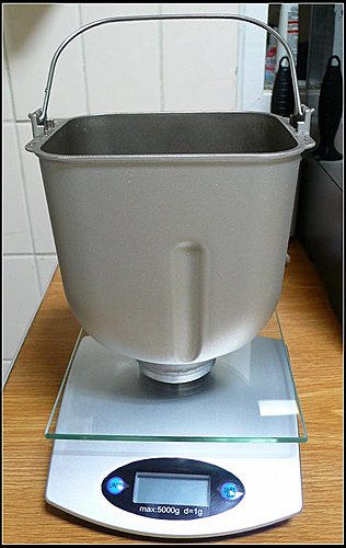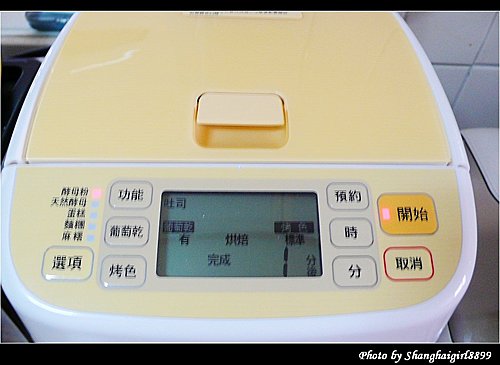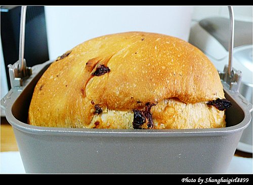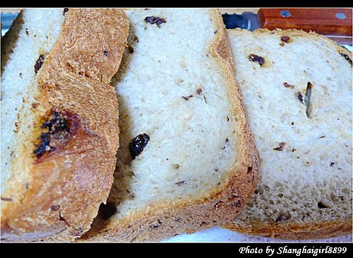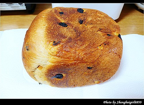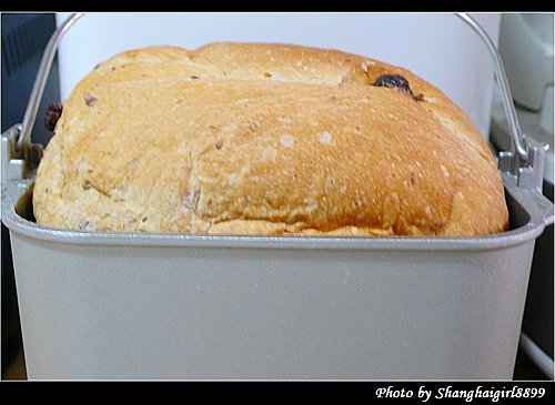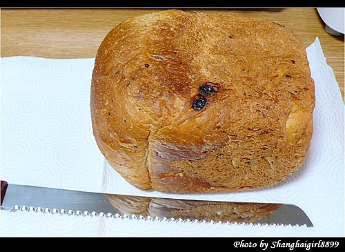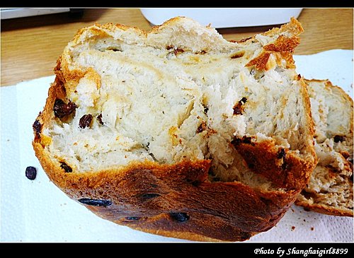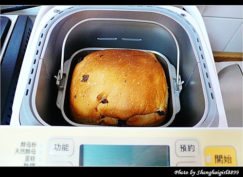 我直接把麵包機的內容器放在料理秤上, 放每種材料的時候直接歸零就好, 簡單又方便 這次做的是最簡單的吐司麵包, 配方完全按照麵包機說明書上的, 只有把奶粉改成牛奶, 6g奶粉改成60ml低脂牛奶, 水的份量也相應減少60ml 第一次做的時候發生了一個小問題, 就是我忘了把攪拌麵團用的葉片放進去了就直接把材料加了進去, 結果只好把材料都倒掉, 把容器洗乾淨, 裝好葉片再重來. 然後把裝好材料的容器放入麵包機內. 這台麵包機的好處是有另外放發酵粉跟葡萄乾的地方, 所以不用等在旁邊放發酵粉跟葡萄乾. 設定好今天早上8點做好, 但不知是我設定錯了還是怎樣, 好像晚了半小時. 所以就急切的在旁邊等, 這時廚房裡已經開始瀰漫起麵包的香氣. 終於還有1分鐘了. 當當當, 懷著忐忑的心情打開了麵包機, 哇, 看起來不錯欸. 麵包rise的也不錯呢 取出來的麵包 換一個角度 因為還沒買切麵包的刀, 只能隨便切了, 樣子有點醜, 不過麵包很鬆軟, 但又有咬勁, 甜度也剛好, 真的是大成功啊 葡萄乾吐司配方: 高筋麵粉: 250g 奶油: 10g 砂糖: 2大量匙 (17g) 奶粉: 1大量匙 (6g, 或牛奶70ml, 我放了60ml牛奶) 鹽: 1小量匙 (5g) 水: 180ml (如放牛奶的話, 要相應減少水的量) 酵母粉: 1小量匙 (2.8g)