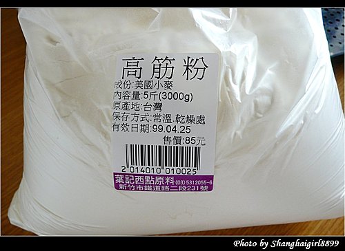 我之前做的麵包是用我在Costco買的日正牌高筋麵粉做的, 酵母粉則是在大潤發買的, 也是日正牌的. 老闆娘說他們家的麵粉比外面超市買的麵粉來的好, 蛋白質的含量比較高. 我回來查了一下, 通常蛋白質含量在 11.5%以上都可叫做高筋麵粉, 市售的高筋麵粉蛋白質含量平均約為 13.5%. 我看了一下日正牌的, 蛋白質含量是13%. 葉記賣的是松鶴牌的, 我不知道蛋白質含量是多少, 下次去看看.